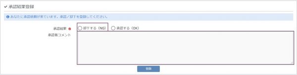 4.データ詳細画面の下部にある承認結果登録にて、「却下する」をチェックします。