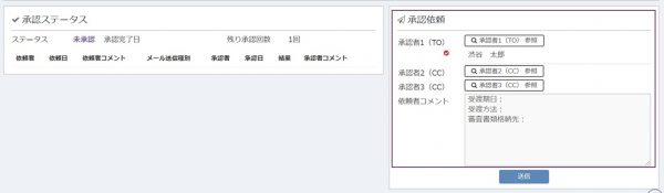 承認依頼画面が表示されていない場合、承認ステータス画面ですでに他の人が承認依頼済みでないかご確認ください。