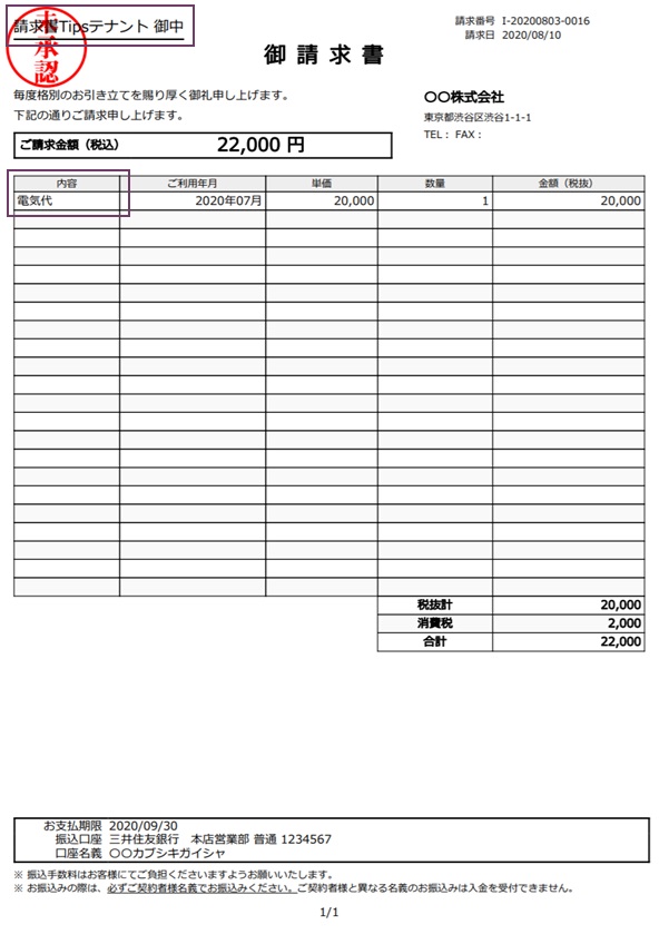 出力したPDFを表示してみます。固定費の請求書はテナントの親会社宛に、変動費の請求書はテナント宛に作成することができました。