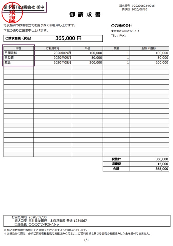 まず、このTipsのゴールとなる請求書の完成イメージ(未承認時)を図示します。