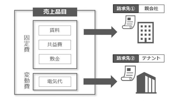 賃料等の固定費をテナントの親会社、水光熱費等の変動費をテナントへ請求する方法を例に説明していきます。