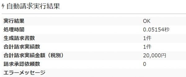 また、該当の自動請求設定詳細画面下部の「自動請求処理実行ログ」にも実行結果が残されます。