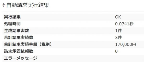また、該当の自動請求設定詳細画面下部の「自動請求処理実行ログ」にも実行結果が残されます。