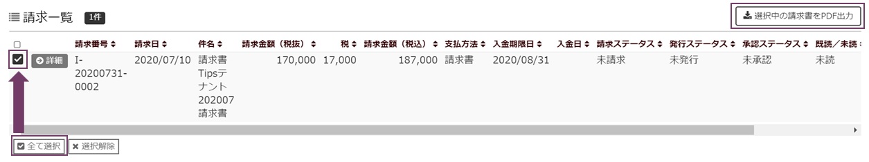 画面中部の請求一覧に、自動請求設定で作成された請求が記載されています。本Tipsでは1件の請求が記載されてきます。