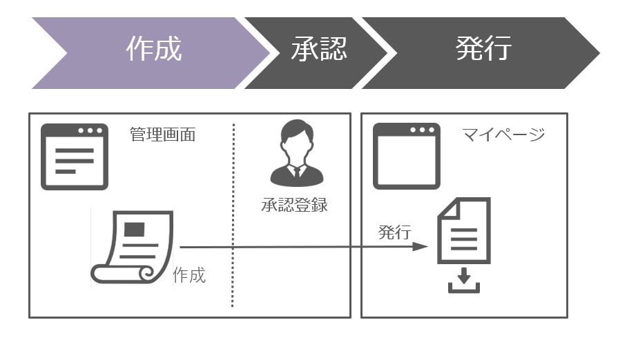 請求書は管理画面で「作成」、「承認」をおこなった後、マイページ上でユーザに「発行」されます。